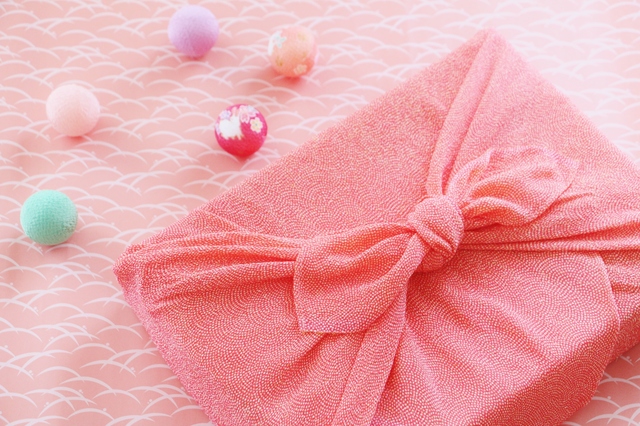 結び目が見えないことでスッキリと控えめな印象になり、お祝いの品に上品な奥ゆかしさを添えたい時に適した風呂敷の包み方です。